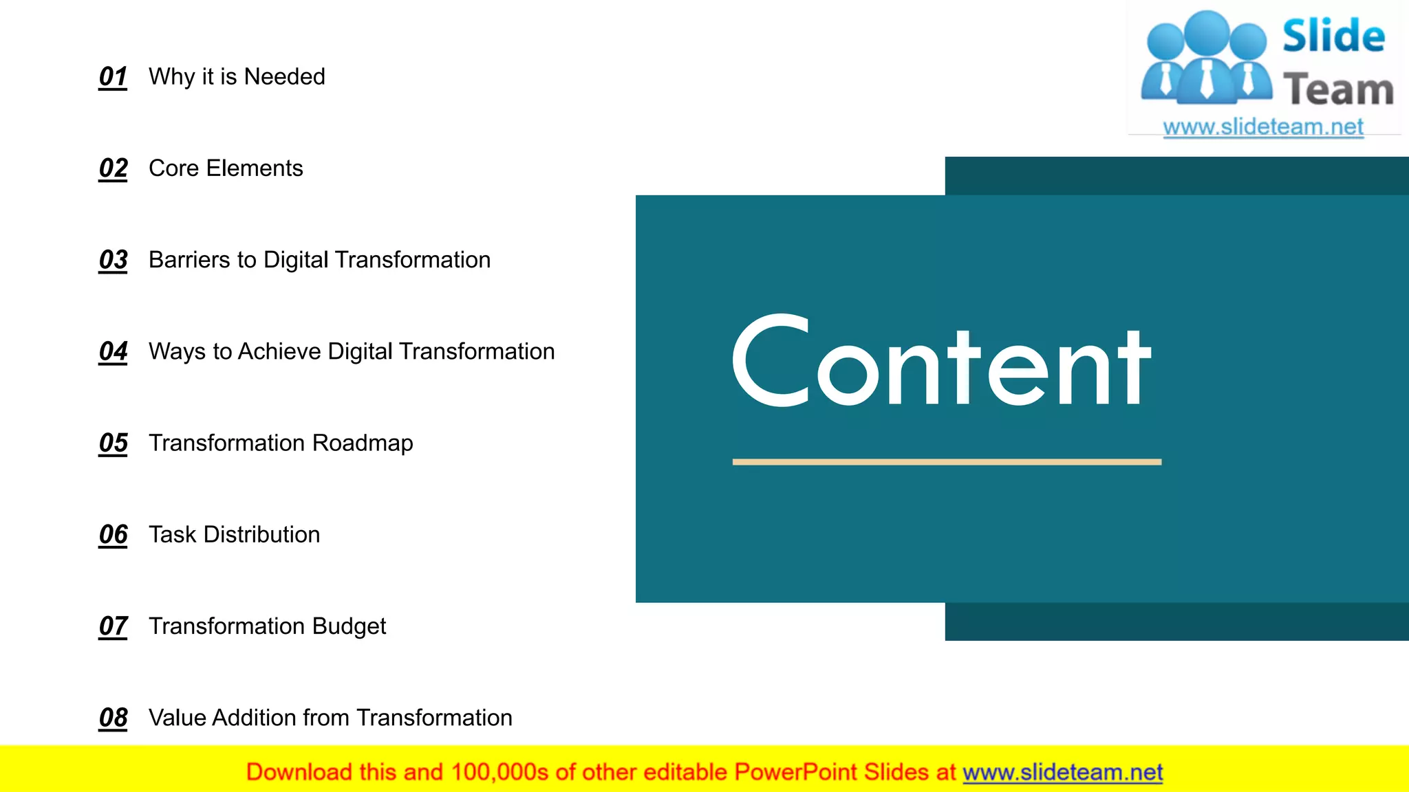 The document outlines a digital transformation solution for companies, detailing its necessity, core elements, barriers, and methods for achieving transformation. It emphasizes the importance of customer understanding, innovation, and resource allocation in the process, along with a roadmap for implementation and associated budget considerations. Additionally, it highlights the positive outcomes of digital transformation, such as increased sales, lead generation, and customer satisfaction.
