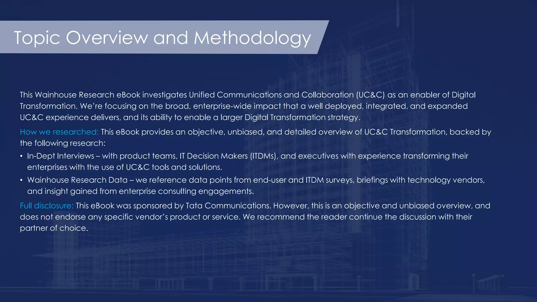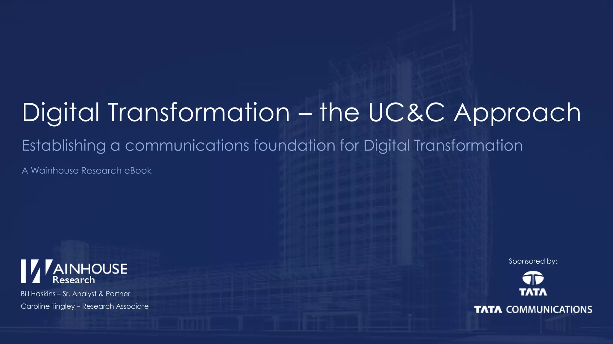 The document is an eBook exploring the role of Unified Communications and Collaboration (UC&C) in facilitating digital transformation within enterprises. It outlines the importance of a comprehensive, integrated communications platform, highlighting the challenges organizations face in adopting UC&C technologies and the need for a structured transformation journey. Various best practices and stages of UC&C adoption are discussed, providing insights into how businesses can effectively implement and benefit from these digital solutions.