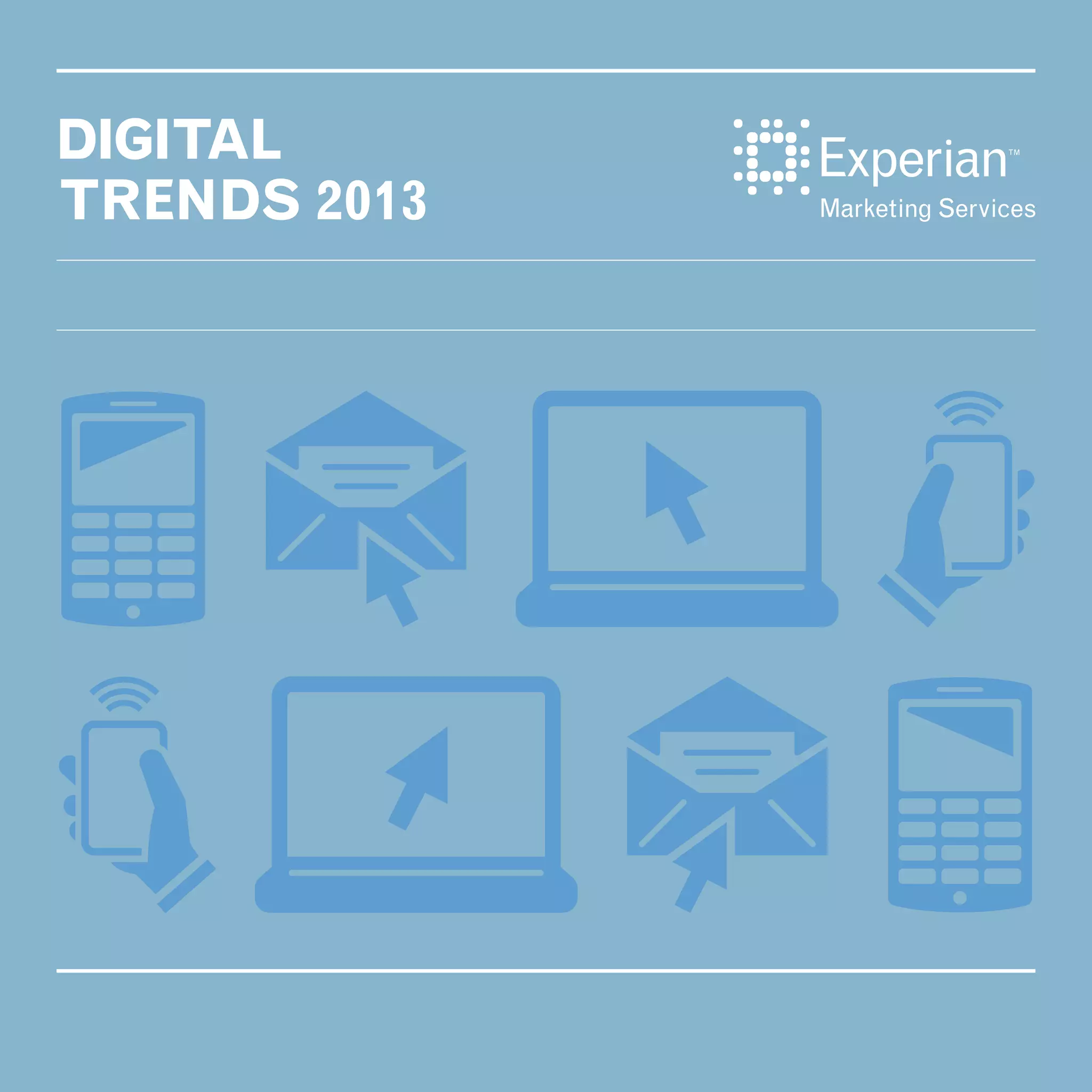 The document outlines key digital trends for 2013, highlighting the ongoing transformation in marketing due to the rise of digital technologies, social media, and mobile platforms. It emphasizes the need for brands to adopt data-driven strategies to effectively engage with consumers across multiple channels and to leverage the growing importance of social media in marketing efforts. Additionally, it discusses the evolving consumer behavior and preferences, particularly the shift towards mobile usage and the significance of email as a reliable communication tool.