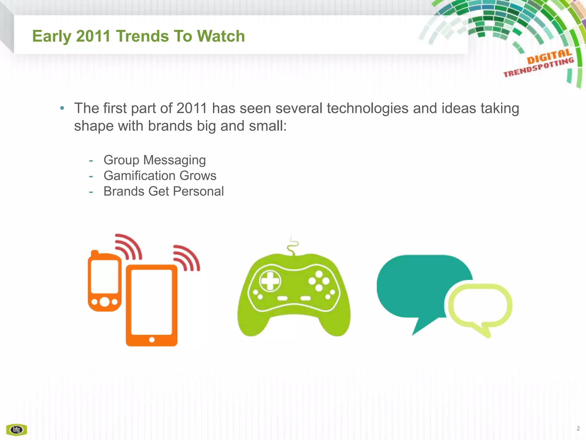 The document discusses early 2011 trends in technology, focusing on group messaging, gamification, and personalized brand engagement. Group messaging apps like GroupMe are being utilized by brands to create targeted conversations for events, while gamification techniques are enhancing user engagement in various domains including TV and retail. Additionally, brands are encouraged to adopt a personal approach in their communication, with emphasis on authenticity, engagement, and social responsibility.