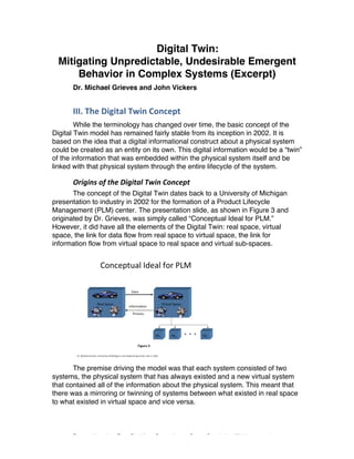 The document discusses the origins and definitions of the digital twin concept. Some key points: