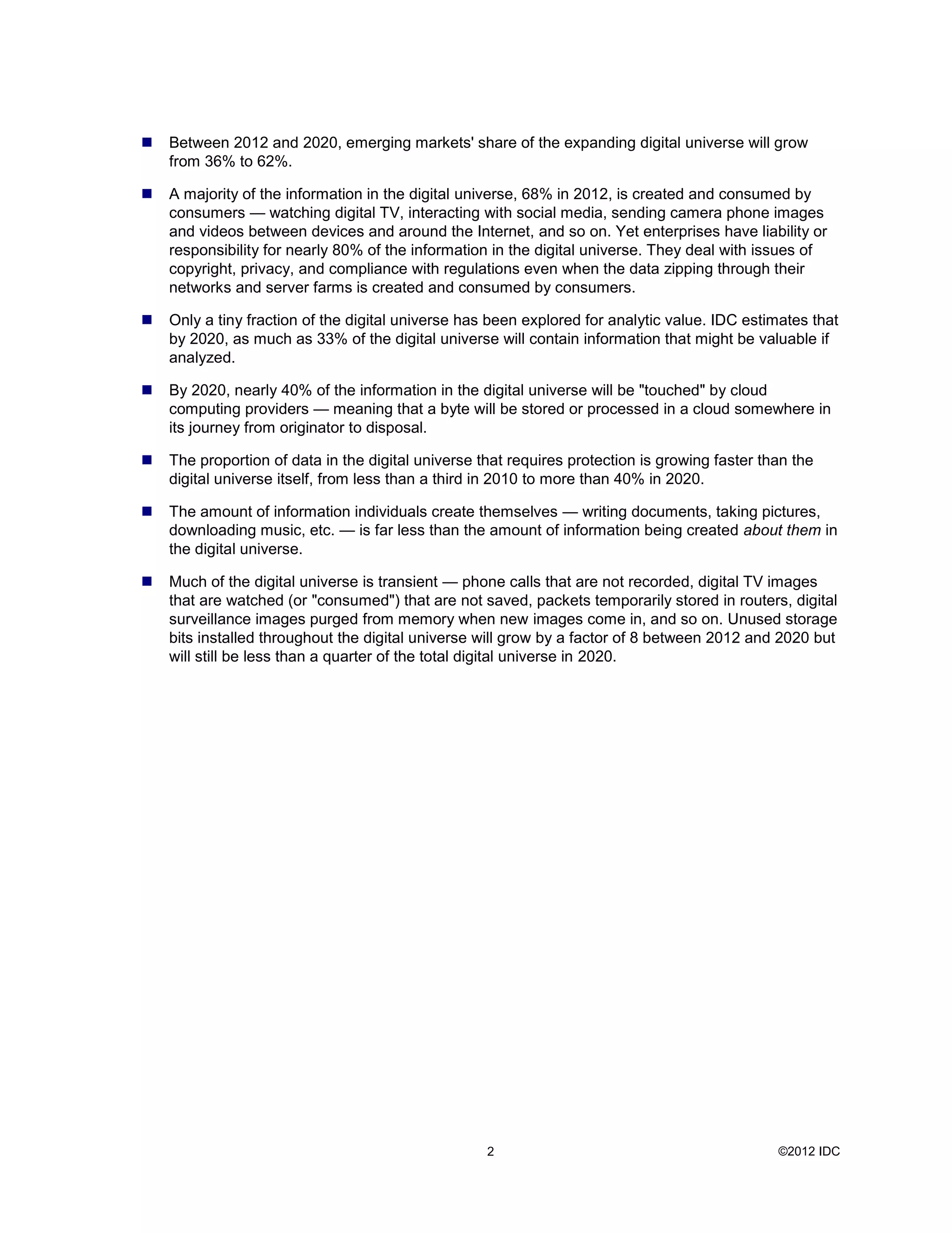- Emerging markets' share of the digital universe will increase from 36% in 2012 to 62% by 2020, with China generating 21% of all digital data by 2020.