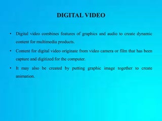 This document discusses digital video, including its sources, types, and characteristics. Digital video combines graphics and audio to create dynamic content. It can originate from video cameras, film, or animation. There are different types of analog video formats like NTSC, PAL, and SECAM, as well as component video formats. Digital video solves issues with analog by providing an identical digital representation without generation loss. The main characteristics of digital video are frame rate, frame size, and color depth.