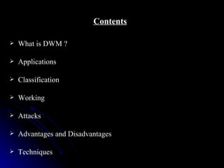 This document discusses digital watermarking (DWM), which involves hiding invisible signatures or visible logos in digital media like images, video and audio. DWM can be used for copyright protection, owner identification and content authentication. Watermarks are classified as perceptible or imperceptible, robust or fragile, and private or public depending on their visibility, ability to withstand modifications, and whether the original data is needed for detection. The document outlines the DWM process, common attacks, advantages, disadvantages and techniques like least significant bit encoding.