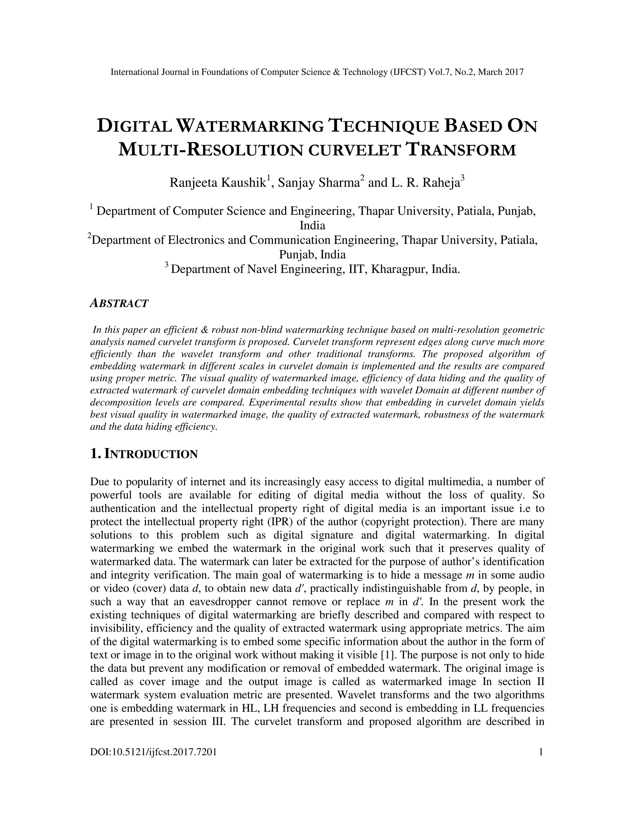 The document presents a robust digital watermarking technique utilizing the multi-resolution curvelet transform for embedding watermarks in digital images. It compares the effectiveness of the curvelet transform with wavelet techniques, demonstrating that the curvelet approach yields superior visual quality, watermark extraction quality, and data hiding efficiency. The study outlines various aspects of watermark system evaluation, including invisibility, effectiveness, robustness, and security.