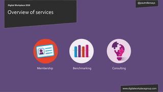 The document discusses preparing for the digital workplace of 2030 and outlines four dimensions that will characterize it: space, capability, intelligence, and beauty. The digital workplace of 2030 will break down boundaries, provide on-demand capabilities through technologies like augmented reality, be powered by artificial intelligence to create a data-driven organization, and focus on user experience, well-being and ethics. The document advocates preparing for these changes through activities like benchmarking, research, and consulting services.