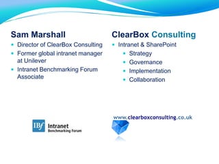 This document presents the Digital Workplace Maturity Model created by ClearBox Consulting. The model assesses digital workplaces across four dimensions: Communication & Information, Structure, Services, and Community & Collaboration. Each dimension has five levels of maturity ranging from Base to Excel. The model uses metaphors like a market, town, city, supermarket and mall to represent different patterns of maturity. The document provides examples and discusses how organizations can use the model to evaluate their current digital workplace and identify strategies to improve in areas that match their business goals.