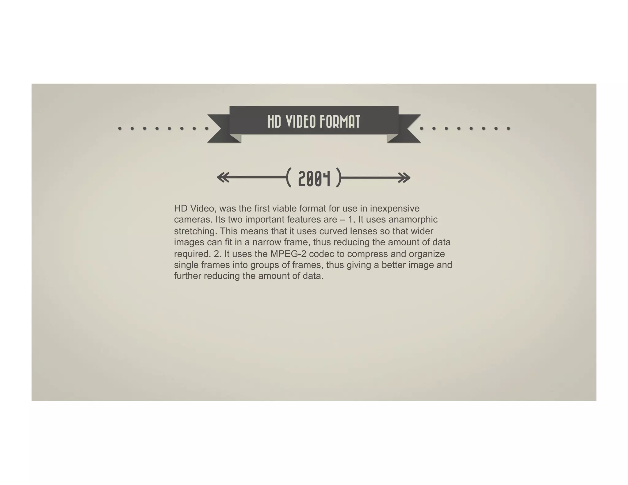 This document provides information about video development and editing. It discusses HD video formats from 2004 that used anamorphic stretching and MPEG-2 compression. It describes video codecs from 1990 to 2003, including H.261 and H.264. It also lists consumer video editing tools like Microsoft Movie Maker, Apple iMovie, Adobe Premiere Pro, and Apple Final Cut Pro. Additionally, it covers editing techniques like L-cuts and J-cuts as well as using b-roll. Finally, it discusses the Rumgr app that allows users to buy and sell used goods locally.