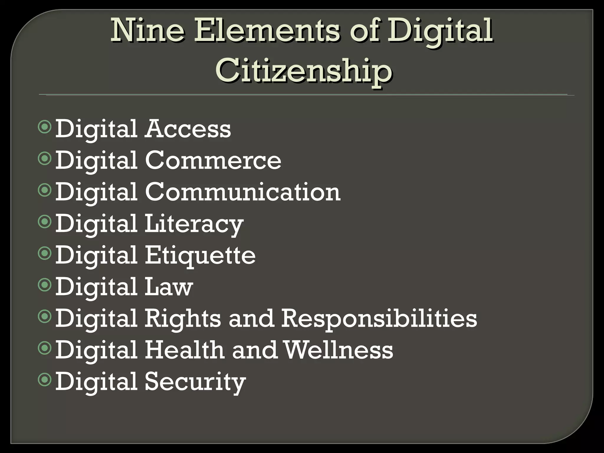 The document defines nine elements of digital citizenship: digital access, digital commerce, digital communication, digital literacy, digital etiquette, digital law, digital rights and responsibilities, digital health and wellness, and digital security. It provides definitions and examples for each element, such as defining digital access as full electronic participation in society and digital commerce as the buying and selling of goods online.