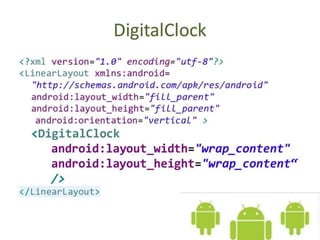 This document provides an overview of digital clocks, including their history, components, and uses. It discusses how the first digital pocket watch was invented in 1883 and the first digital alarm clock was patented in 1956. The main components of a digital clock are described as the 74LS47 IC, 74LS90 IC, 74HC32 IC, function generator, push button DPST, and 7 segment display. Digital clocks are widely used in devices like cars, radios, TVs, microwaves, ovens, computers, and cell phones to display the time digitally. The advantages of digital clocks are noted as being less expensive, easier to read accurately, and simpler to understand than analog clocks.