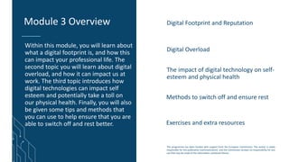 This document presents Module 3 of a program funded by the Erasmus+ programme, focusing on the impact of digital activities on health and professional life, covering topics like digital footprints, digital overload, and effects on self-esteem and physical health. It highlights the importance of managing one's online reputation and the risks of digital overload, which can lead to mental health issues. Additionally, useful tips for maintaining digital well-being and fostering work relationships in remote settings are provided.