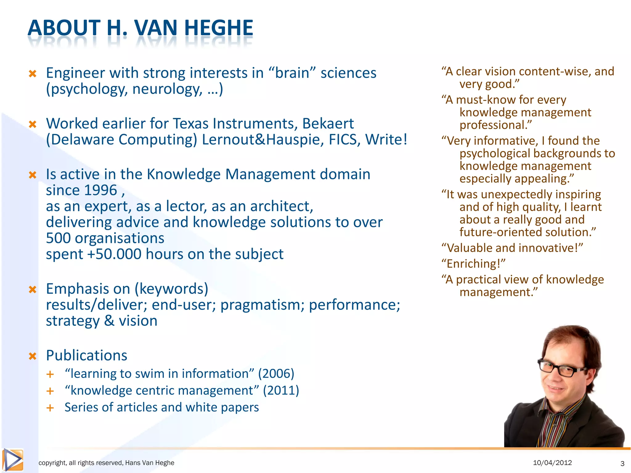Hans van Heghe is an expert in knowledge management with extensive experience in consulting and advising over 500 organizations since 1996. He emphasizes the importance of knowledge as a competitive resource and highlights the inefficiencies in organizations caused by poor information management, such as lost time and opportunities. The document provides insights into knowledge management practices, frameworks, and the significance of automated systems to enhance knowledge accessibility and usability.
