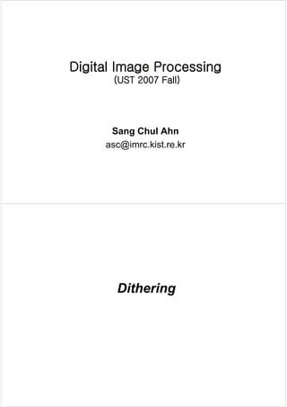 This document discusses various digital image processing techniques including dithering, warping, morphing, and view morphing. Specifically, it describes: