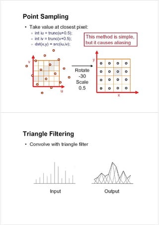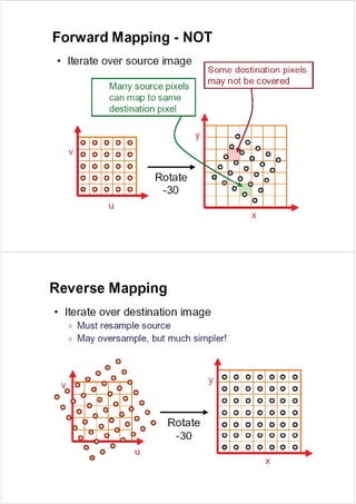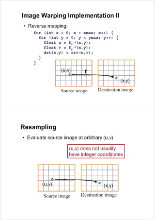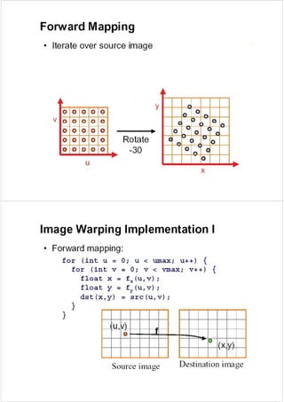- Image warping methods like affine, projective, and bilinear mappings to rearrange pixel positions.