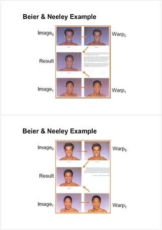 - Morphing as a process to create a smooth transition between two images using warping, color interpolation, and cross-dissolving.