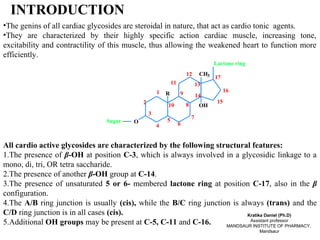 1. Cardiac glycosides are characterized by steroidal genins with β-OH groups at C-3 and C-14, and an unsaturated lactone ring at C-17.