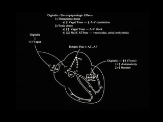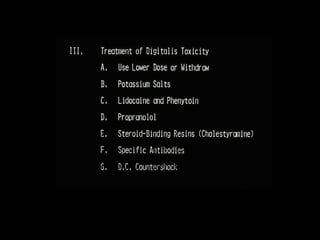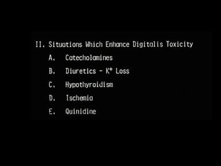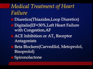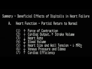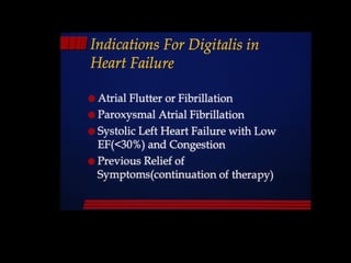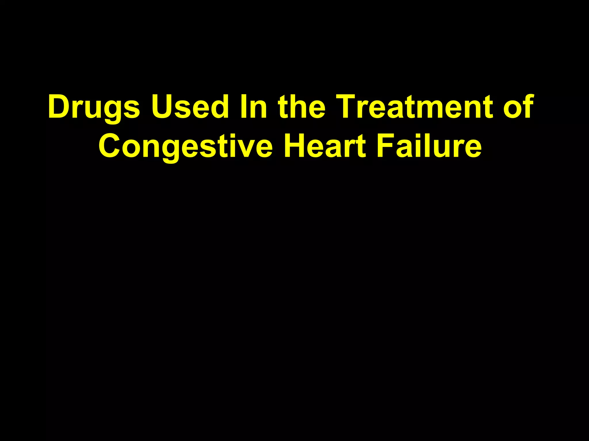 This document discusses drugs used to treat congestive heart failure. It lists several classes of drugs including inotropes like digoxin, diuretics like furosemide, ACE inhibitors like enalapril, and ARBs like losartan. It provides details on digoxin including its neurohormonal effects, toxicity risks, and studies showing its effects on worsening of CHF and overall mortality.