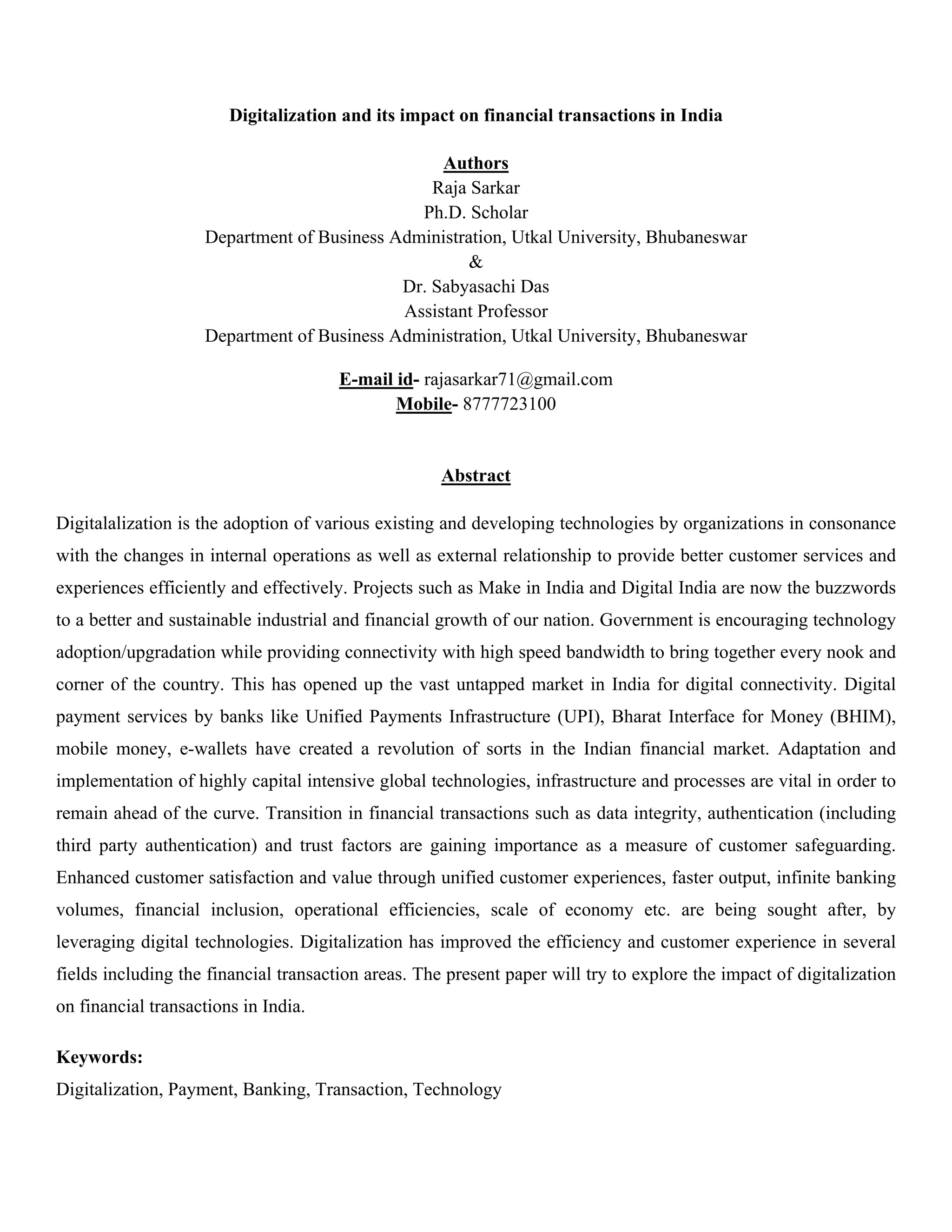 This document discusses the impact of digitalization on financial transactions in India. It provides an overview of various digital payment platforms in India like UPI, QR codes, e-wallets, and cards that have made transactions more convenient. The government's Digital India program aims to connect rural areas and improve digital literacy. Digitalization benefits both customers and financial service providers by improving convenience, security, cost savings and competitiveness. However, risks like online frauds and lack of financial literacy remain challenges. The paper analyzes the progress of digitalization in India and its effects on the financial sector.