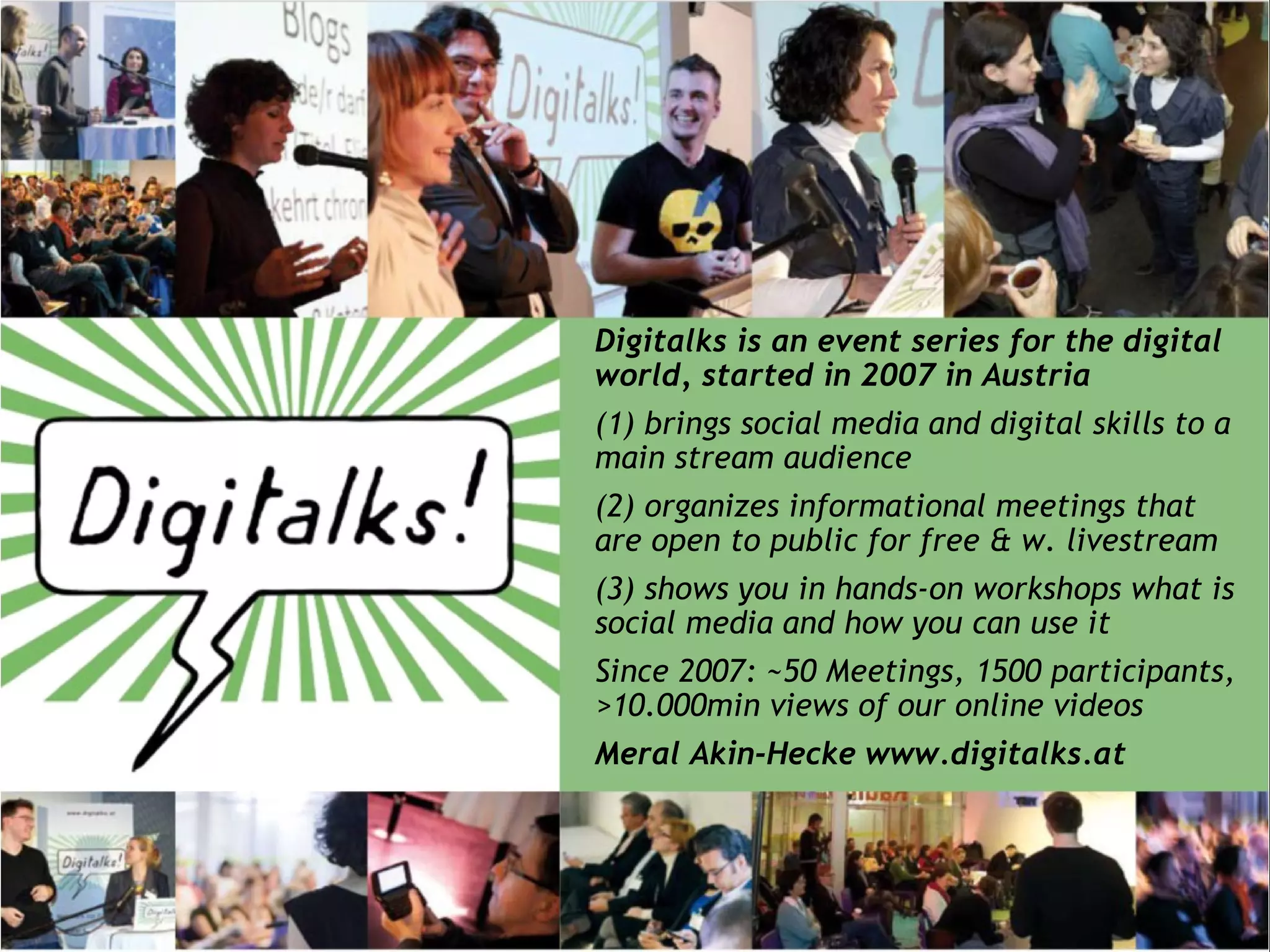 Digitalks is an event series that brings social media and digital skills to mainstream audiences by organizing free and publicly accessible informational meetings that are also livestreamed, and hands-on workshops showing how to use social media. Since 2007 it has held around 50 meetings with 1,500 participants and over 10,000 minutes of views of its online videos.