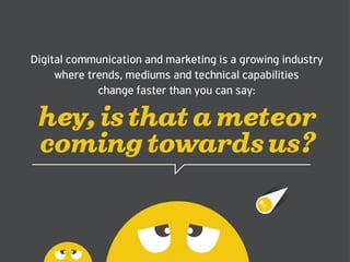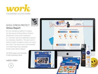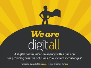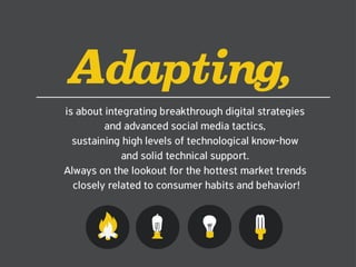 This document provides an overview of the services offered by a digital marketing agency, including web development, social media marketing and strategy, creative services like design and illustrations, performance marketing like SEO, content production, mobile marketing, and clients served between 2010-2015 such as NIVEA, Sephora, and Adidas.