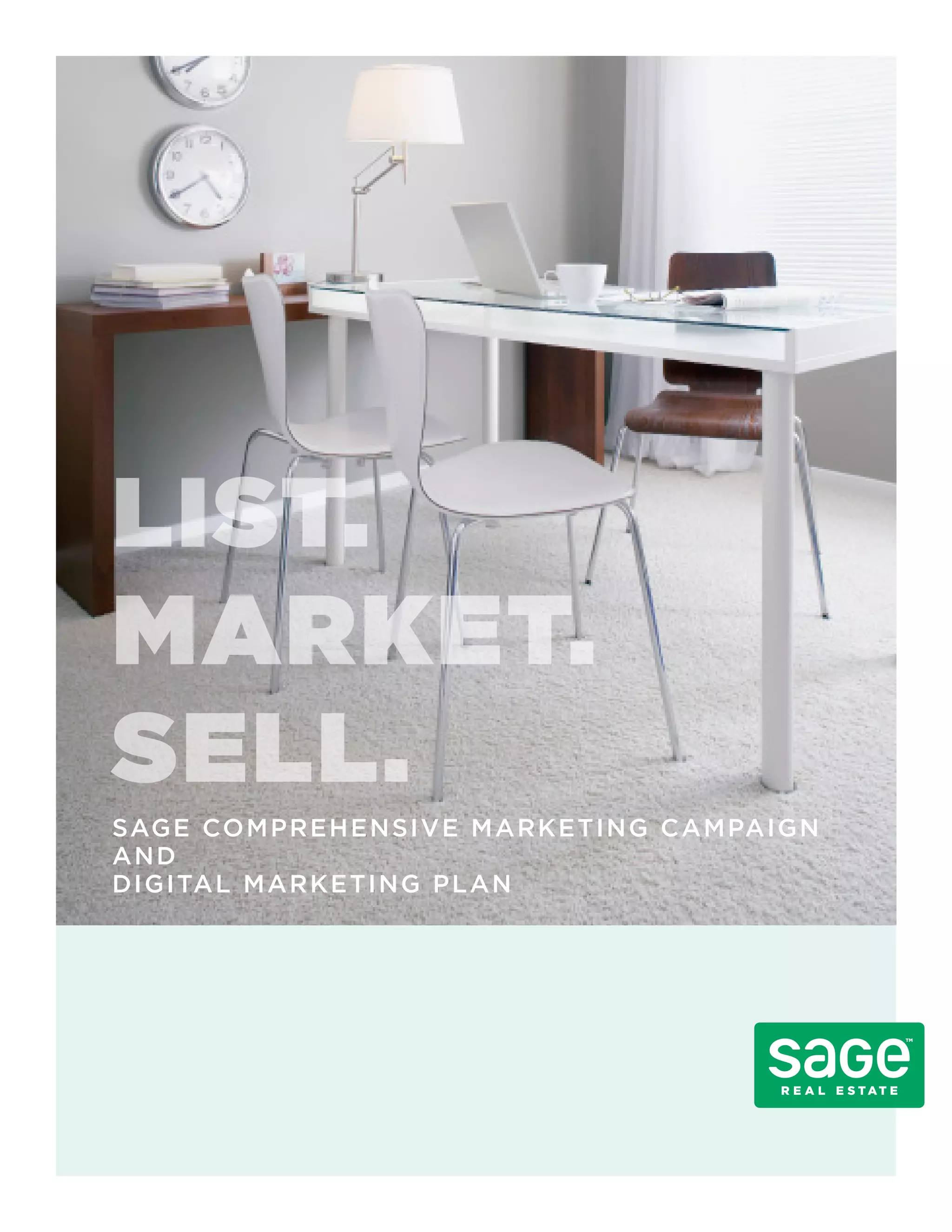Sage Real Estate has developed a comprehensive marketing campaign utilizing traditional and digital marketing tools to maximize exposure for listings. The campaign includes professional photos, feature sheets, signage, an individual listing website with photos and virtual tour, social media promotion, and paid search advertising. This wide-reaching multi-platform approach aims to attract the largest possible audience to sell homes quickly at top prices.