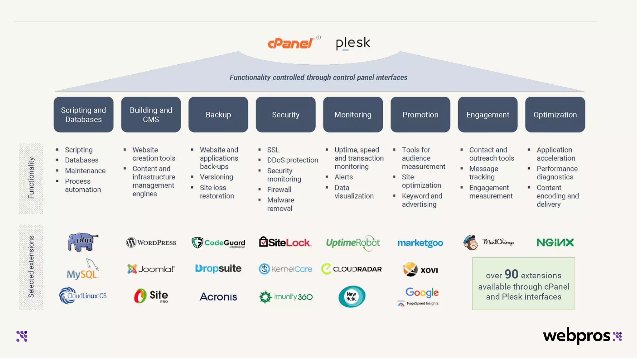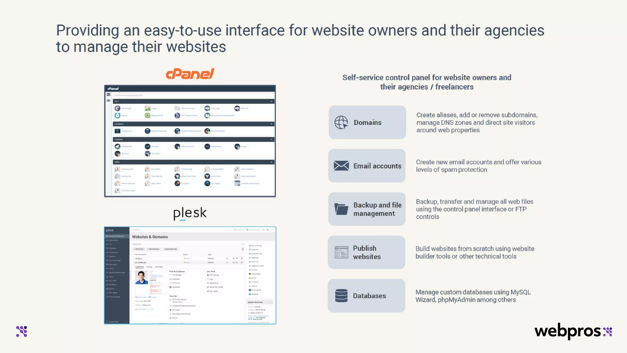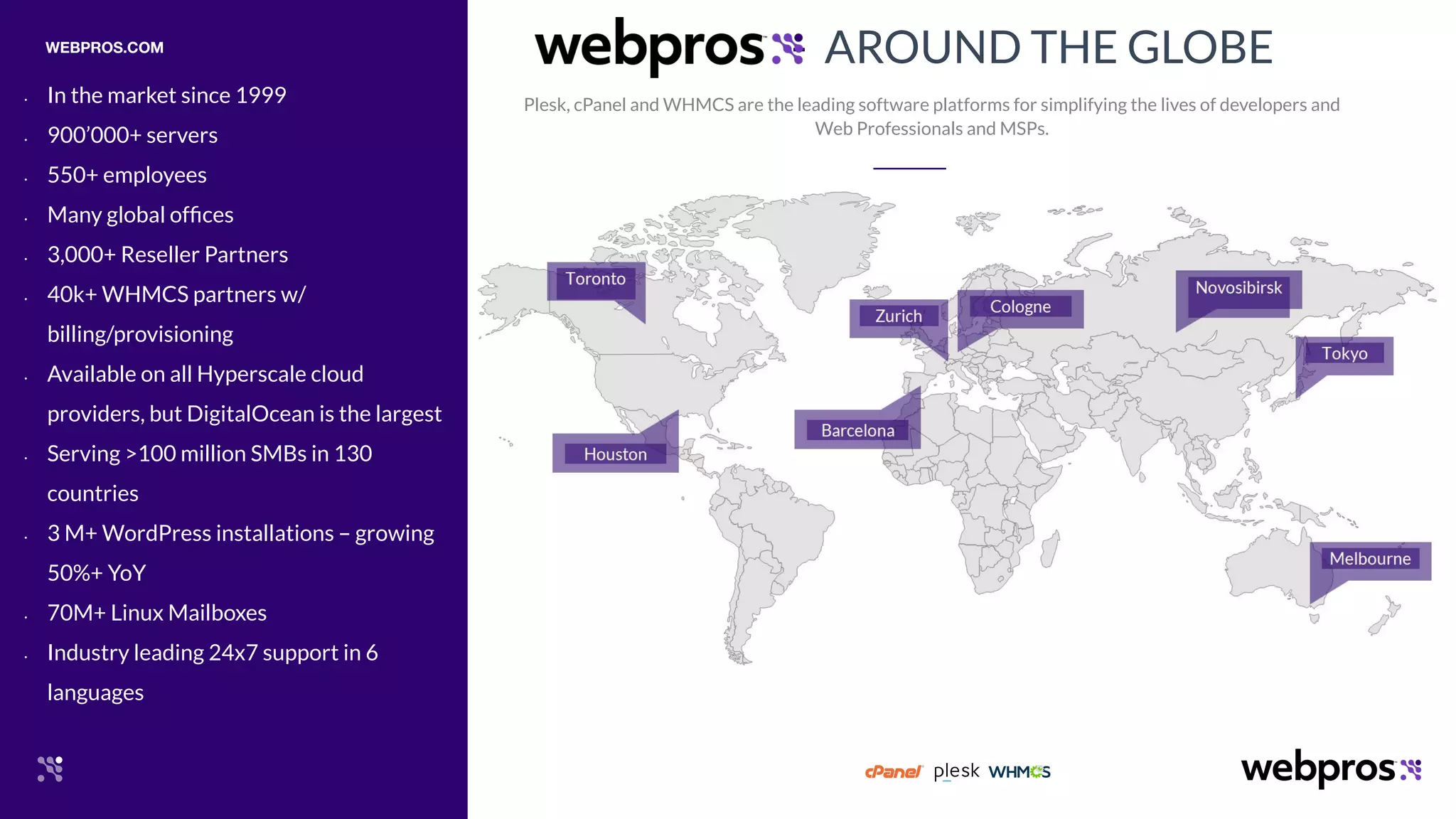 The document highlights the services provided by WebPros, which has been operational since 1999, catering to managed service providers (MSPs) and web professionals with a focus on simplifying their workflows through platforms like Plesk and cPanel. It emphasizes their extensive global infrastructure, with over 900,000 servers and a robust support system, allowing agency and MSP partners to scale and automate their services efficiently. Furthermore, it discusses the importance of transitioning to cloud-based solutions, offering opportunities for SMBs to enhance their digital transformation with scalable and secure hosting solutions.