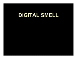 Digital smell technology uses scent synthesizers and cartridges containing 128 chemicals to generate smells and broadcast scents to enable virtual smell experiences. Founders Dexster Smith and Joel Lloyd developed the iSmell device for Digiscents which uses natural oils, synthetic fragrances, and heat or air pressure to emit smells. The technology can be used for marketing, entertainment, education, and medical applications over theaters, the internet, and other media to enhance user experiences.
