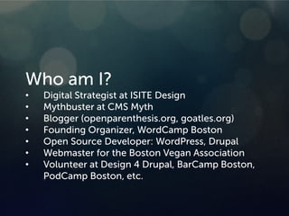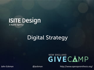 This document outlines John Eckman's background and expertise in digital strategy. It discusses key aspects of developing an effective digital strategy, including defining goals and audiences, choosing appropriate digital channels, and managing limited resources. It also covers content strategy, responsive design, mobile-first approaches, analytics, and key takeaways such as focusing efforts and continuously optimizing. Upcoming events that John is involved in organizing are also listed.