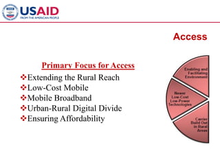 The document discusses USAID's digital development initiatives focused on expanding access to connectivity and mobile applications. It aims to extend rural access through low-cost mobile and broadband technologies. Key areas of focus include facilitating regulatory environments, universal access programs, and leveraging new technologies. USAID also supports the development and sharing of scalable, replicable mobile applications. This includes establishing cloud services and an applications marketplace. Mobile money programs are highlighted as a priority to increase financial inclusion through partnerships with governments, donors, and private sector actors. The goal is to replicate successes like M-Pesa in new countries through risk capital, enabling policies, and multi-sector collaboration.