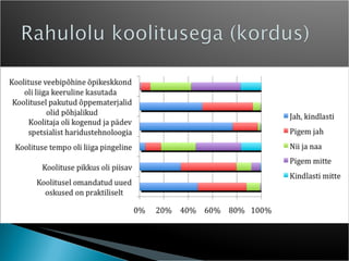 Tagasisideküsitlus koolituse lõpul: Vanuseline jaotus : 40-45 (20%), 45-50 (19%) Geograafiline: Ida-Viru (17%), Tartumaa (12%), Harju-, Pärnu- ja Raplamaa (9%) Aineti: võõrkeeled (20%), klassiõpetajad (19%), loodusained (16%), loovained (15%) Kordusküsitlus mitu kuud hiljem: klassiõpetajad ja 40-45 aastased vastasid aktiivsemalt