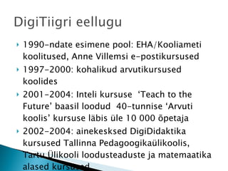 1990-ndate esimene pool:EHA/Kooliameti koolitused, Anne Villemsi e-postikursused 1997-2000: kohalikud arvutikursused koolides 2001-2004: Inteli kursuse ‘Teach to the Future’ baasil loodud 40-tunnise ‘Arvuti koolis’ kursuse läbis üle 10 000 õpetaja 2002-2004: ainekesksed DigiDidaktika kursused Tallinna Pedagoogikaülikoolis, Tartu Ülikooli loodusteaduste ja matemaatika alased kursused