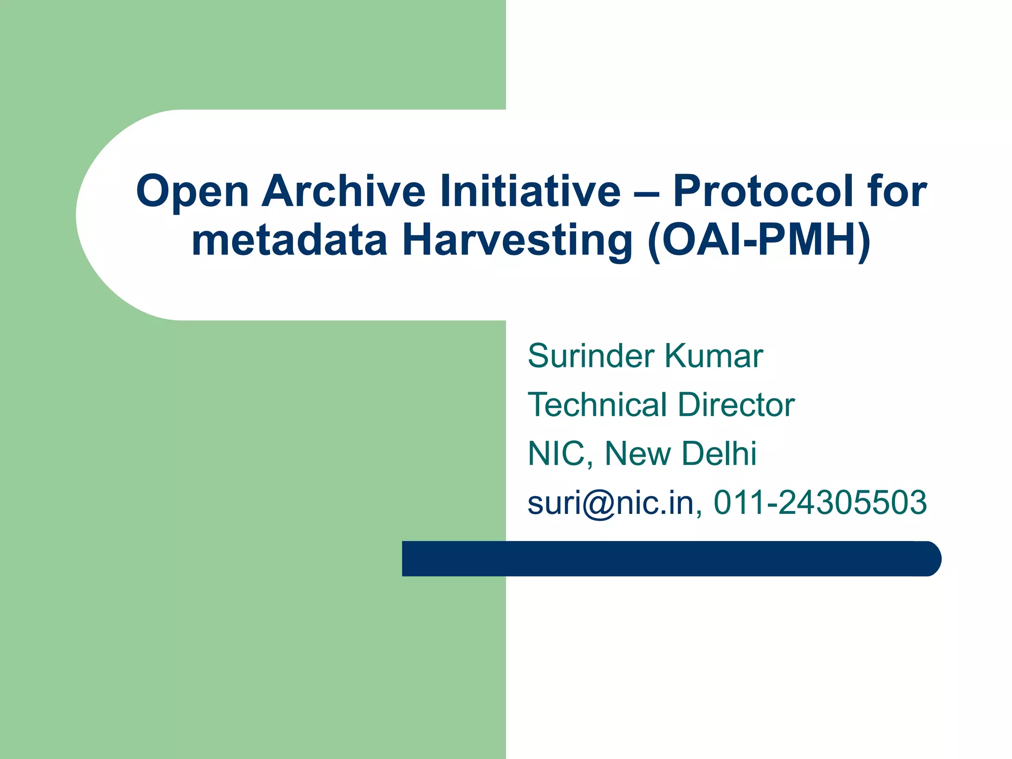 The document discusses the Open Archive Initiative Protocol for Metadata Harvesting (OAI-PMH). It describes OAI-PMH as a standard that allows data providers to make metadata available via HTTP so that service providers can harvest the metadata to develop value-added services. It provides details on the various requests and operations that are part of the OAI-PMH protocol. The document also discusses some implementation issues and examples of service providers that utilize OAI-PMH harvested metadata.