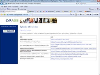 The document outlines best practices and guidelines for digitizing analogue materials within academic libraries, emphasizing the importance of selecting valuable collections, planning projects, and ensuring compliance with copyright laws. It discusses the technical aspects of digitization, including scanning specifications and preservation strategies, while raising critical questions about the impact and purpose of digitization on institutional missions. Overall, it serves as a comprehensive resource for library professionals embarking on digitization projects, aiming to enhance access to information and support research.