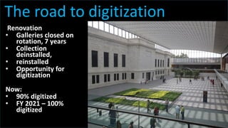The Cleveland Museum of Art is advancing its mission of creating transformative experiences through art by focusing on digitization, with plans to achieve 100% digitization by FY 2021. The museum is utilizing data analytics to evaluate visitor engagement and experiences, particularly with interactive exhibits like the ArtLens Gallery, which has shown increased visitor time and deeper interactions. Recent findings indicate a significant impact of the ArtLens Gallery on visitor behavior, leading to a broader understanding of engagement and the museum's goal of reaching one million annual visitors.