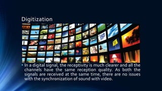 The document discusses digitization in television broadcasting in India. It summarizes that digitization provides clearer reception and synchronization of sound and video. It then outlines the phases of digitization in India, with the goal of full digitization by 2016. The key events were a 2010 report recommending digitization, a 2011 bill amending cable regulations to require an encrypted digital transmission system, and a four phase plan between 2012-2016 to roll out digitization in major cities and then all of India. Digitization is expected to provide benefits like improved picture and sound quality, on-demand content, and allowing viewers to pay only for desired channels.