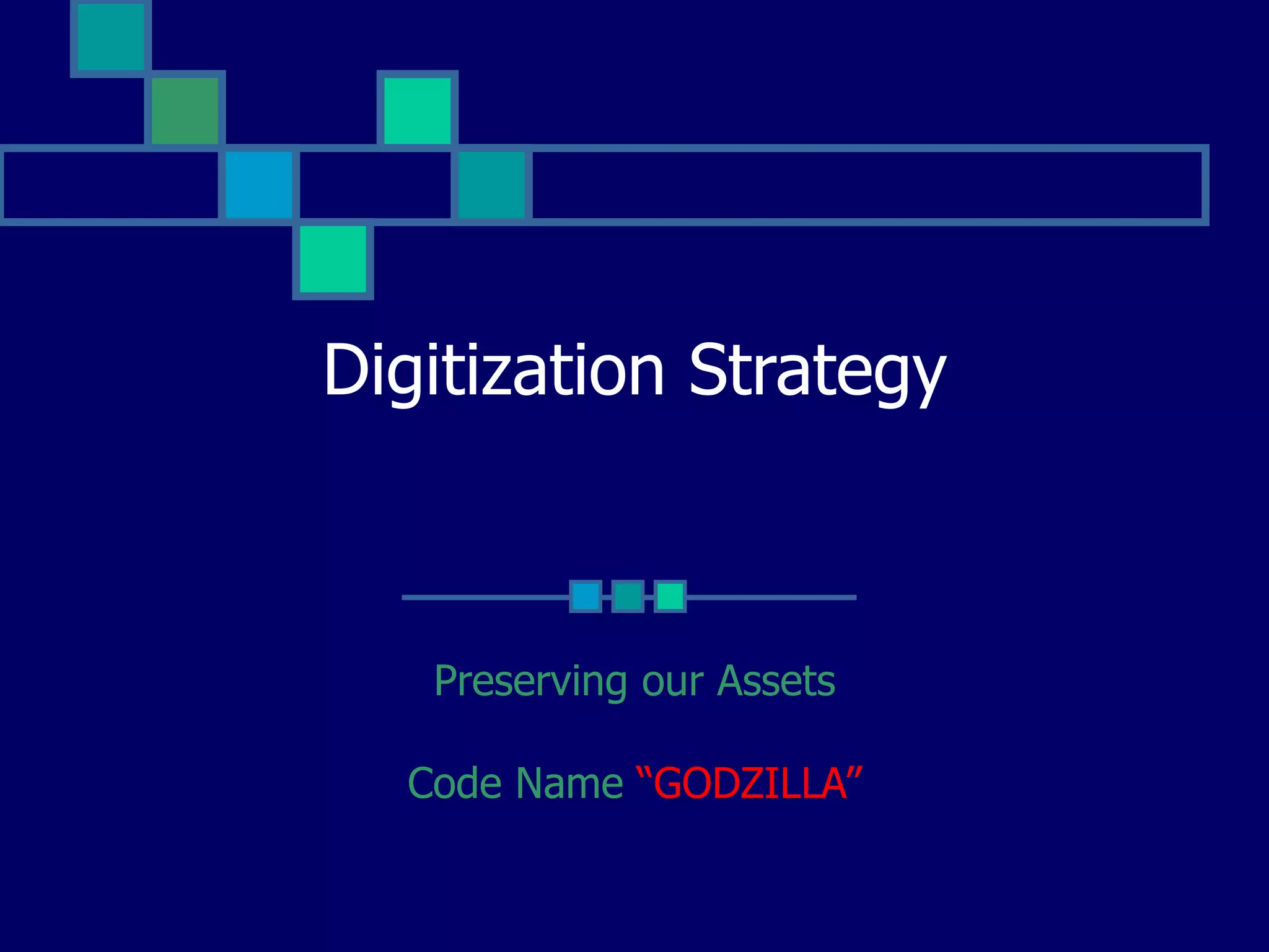 The document discusses an organization's effort to digitize its assets called "Project Godzilla". It outlines why digitization is important for preservation, accessibility and efficiency. The organization plans to establish a digitization team to develop a strategy and scope, purchase software to manage digital assets, and hire a specialist to oversee the project. The team's goals are to create an overall strategy, define the scope, prioritize work, and lay the foundation for workflow changes. Some initial progress includes purchasing storage and asset management software and beginning to digitize certain assets.