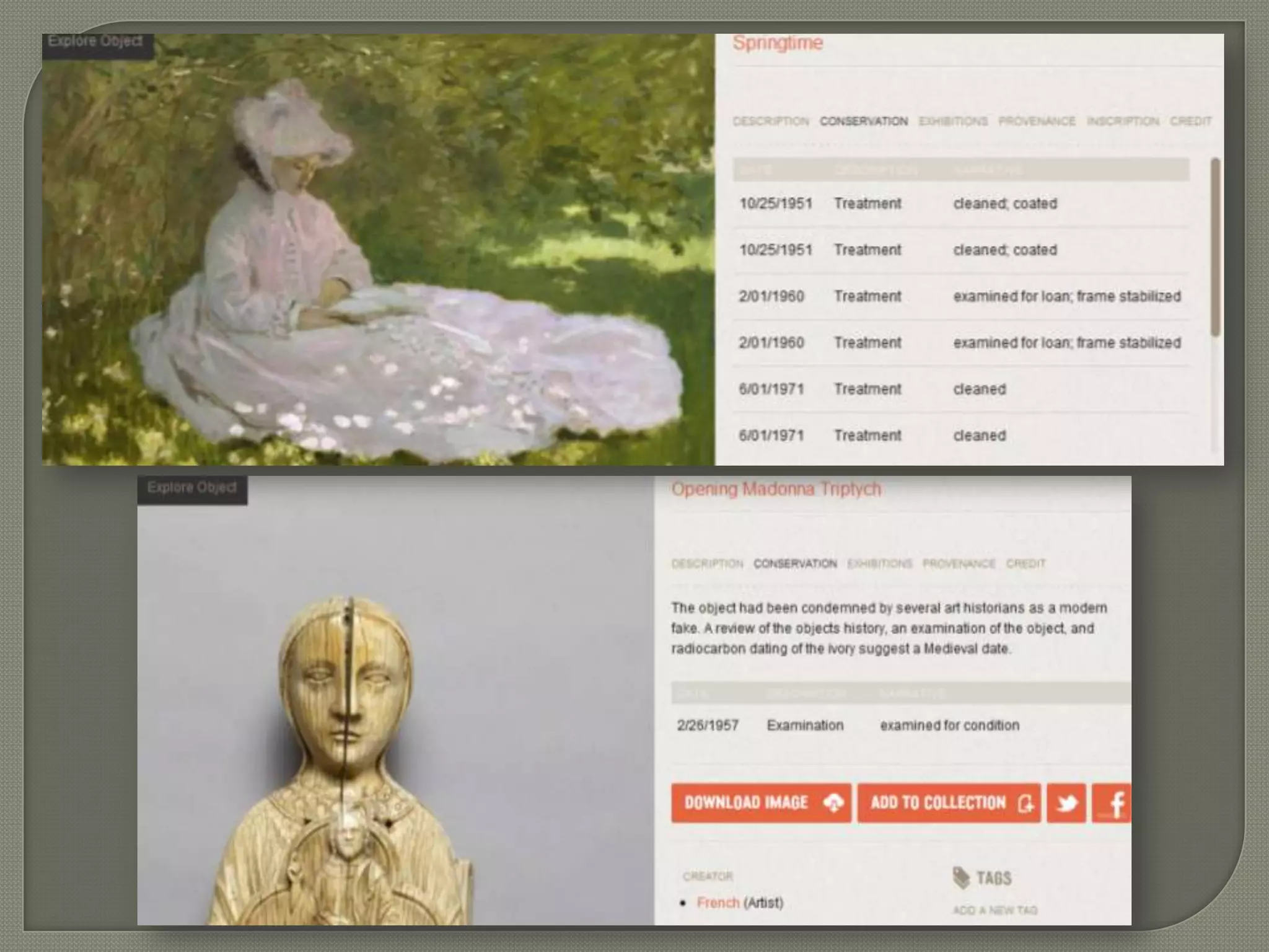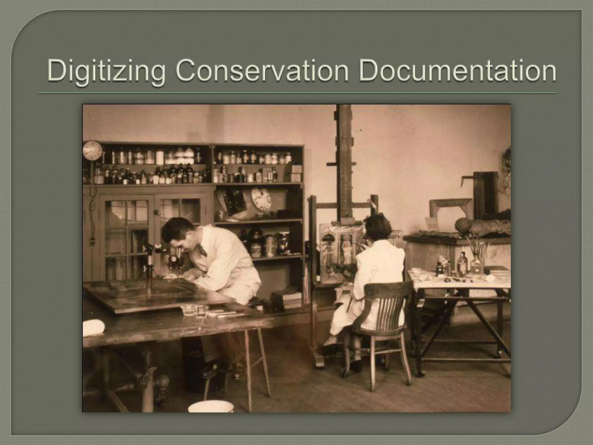 The document discusses plans to catalog and publish online conservation histories and information for 5,000 works of art. It recommends using a license-free conservation tracking system to scan paper files, transcribe information into records, and digitize materials. It notes that the published data will include keywords, activity types and dates in a grid format, and may also include abstracts or narratives when available. The information will be shared on the museum's website and issues remain to be addressed creatively.