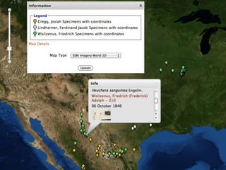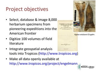 The document outlines the digitization project led by Chris Freeland at the Missouri Botanical Garden, aimed at selecting, databasing, and imaging 8,000 herbarium specimens from the Great American Frontier and integrating geospatial analysis tools into the Tropicos database. It emphasizes the significance of these specimens in documenting plant species' occurrences and their importance to American scientific and cultural heritage. The project aims to make all data openly accessible to enhance research and analysis related to biodiversity.