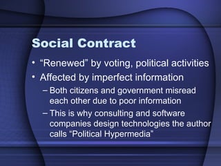 The document discusses how new media and digital technologies have evolved political campaigns and the production of modern political culture. Political campaigns now use more consultants, opinion polls, and the internet to target specific audiences. However, some argue that these technologies amplify existing politics and do not necessarily have a direct impact on democracy. While new media may help overcome inadequate one-way political messages and engage new participants, there are also concerns about simplification of political content and potential to overwhelm officials. Technologies now allow detailed data mining and surveillance of citizens to predict reactions and ensure campaign success, but this raises issues around privacy and how information is actually used.