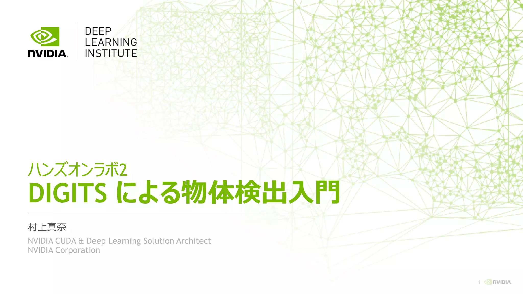 このスライドは 2017 年 1 月 17 日 (火)、ベルサール高田馬場で開催された「NVIDIA Deep Learning Institute 2017」のハンズオン トレーニング「DIGITS による物体検出入門」にて、エヌビディア合同会社 ディープラーニング部 村上 真奈が解説しました。