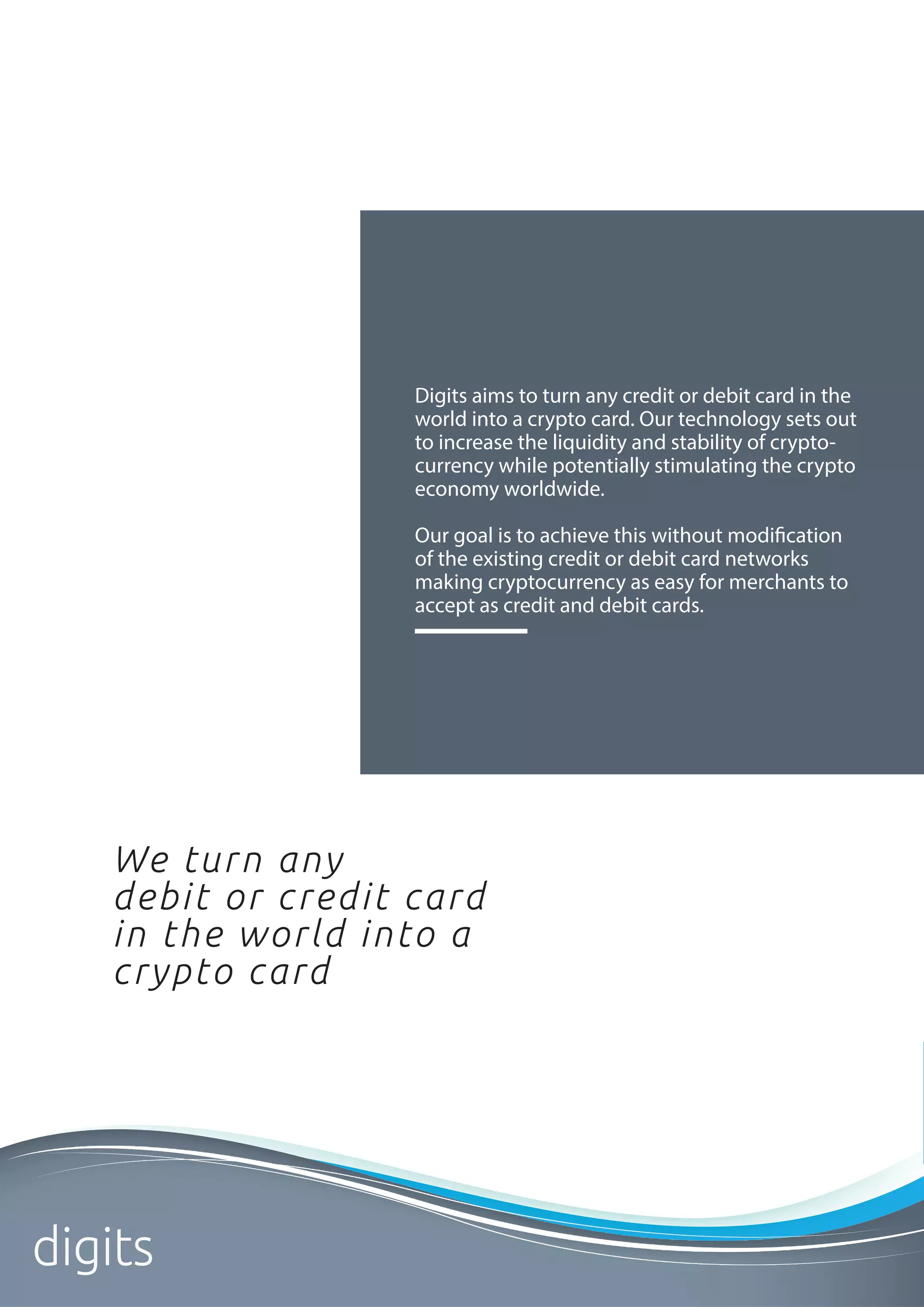 Digits aims to turn any credit or debit card into a crypto card by integrating cryptocurrency payments into the existing credit and debit card networks. This would allow consumers to easily pay for goods and services with cryptocurrency using their existing credit/debit cards. On the backend, purchases would be instantly funded using the consumer's cryptocurrency funds, making the process similar for merchants as traditional card payments. The goal is to increase cryptocurrency adoption by making it as easy to use as traditional payment methods.