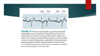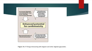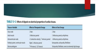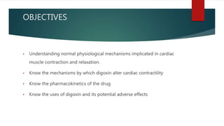 Digoxin is used to treat heart failure and atrial fibrillation. It works by inhibiting the sodium-potassium pump in cardiac cells, increasing intracellular calcium levels and strengthening heart muscle contractions. The optimal serum concentration is 0.5-0.9 ng/mL. Adverse effects include nausea, vomiting, arrhythmias, and can be caused by electrolyte imbalances or drug interactions. Digoxin is primarily excreted unchanged in urine and its half-life is increased in renal impairment. It is indicated to treat heart failure with reduced ejection fraction or atrial fibrillation with a rapid ventricular response.