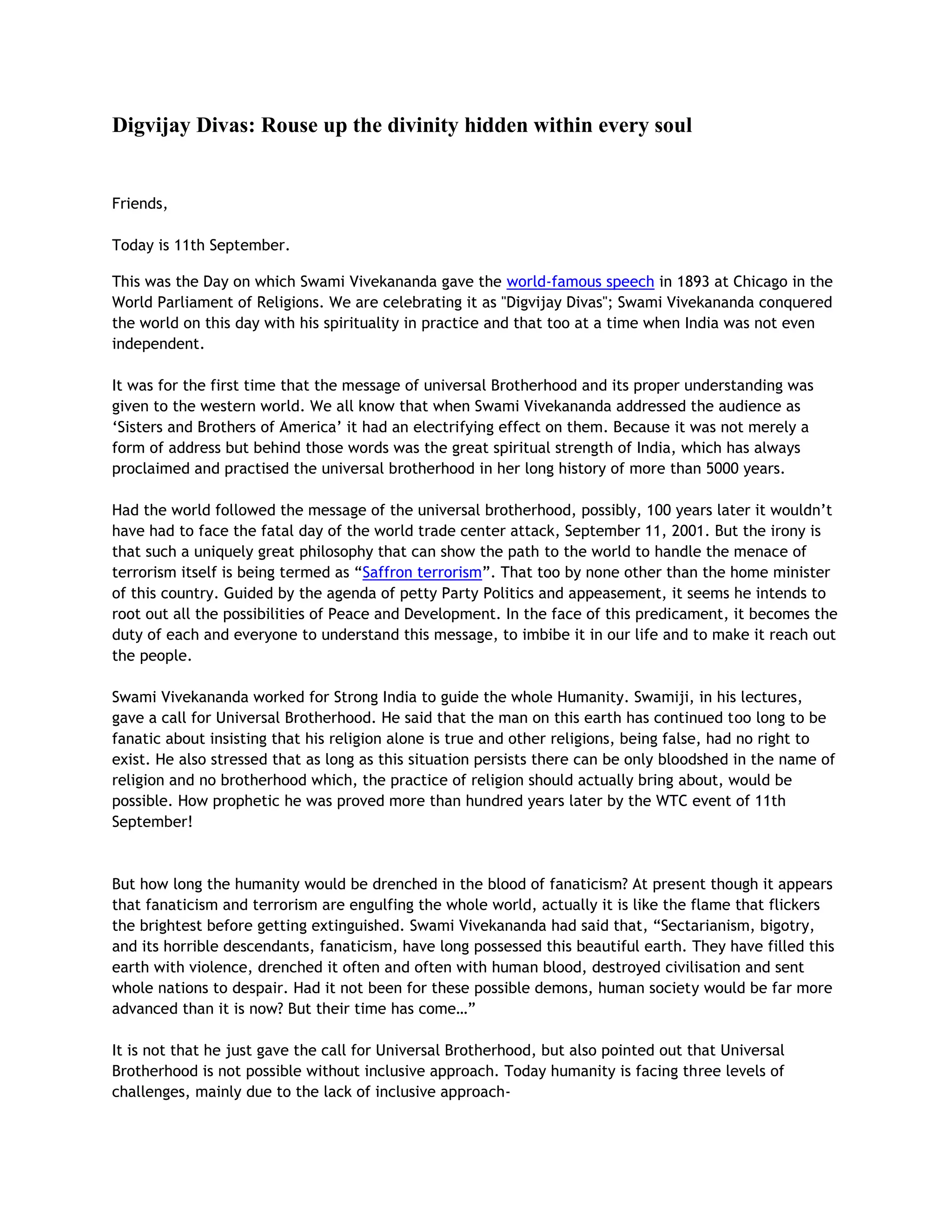 The document celebrates 'Digvijay Divas' in honor of Swami Vivekananda's impactful speech at the 1893 World Parliament of Religions, emphasizing the importance of universal brotherhood and spirituality. It critiques present-day issues of fanaticism and the politicization of religion, advocating for an inclusive approach to foster peace and development, particularly in Gujarat's model of growth. The message encourages individuals to embody Swami Vivekananda's teachings in their lives for a stronger, united India and humanity.