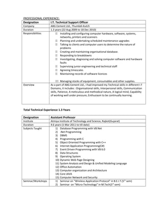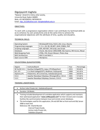 The document contains a resume for Digvijaysinh Vaghela. It summarizes his objectives, technical skills, education, training, professional experience teaching as an assistant professor, and major projects completed. His technical skills include programming languages like C, C++, Java, databases like Oracle and SQL Server, and web design tools. He has a Master's degree in computer science and engineering and over 5 years of experience in teaching and over 1 year of experience in IT support. His projects include medical management, physiotherapy clinic, and city guide web applications.