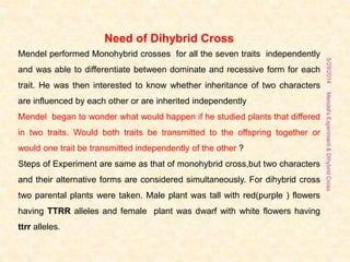 The document outlines Gregor Mendel's experiments on hybridization, specifically focusing on dihybrid crosses and their significance in understanding inheritance patterns. Mendel's findings led to the formulation of the law of independent assortment, which states that different traits are inherited independently. The document also discusses the methodologies, ratios obtained from crosses, and the concepts of back crosses and test crosses.