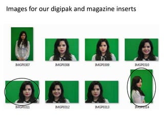 The document discusses images selected for use in a digipak and magazine inserts. The circled images are liked and likely to be used. An image of the artist from mid-shot or long-shot is preferred for the digipak cover over a close-up. An image of the artist looking over her shoulder is selected for the digipak back. An image of the artist's lips was considered for the front but not deemed effective and will likely be used inside instead. A cheeky, flirty pose image is chosen for the magazine inserts to appeal to both men and women.