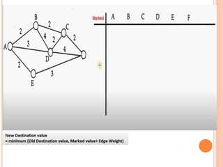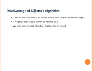 This document discusses Dijkstra's algorithm, which is a solution to the single-source shortest path problem in graph theory. It finds the shortest paths from a source vertex to all other vertices in a graph. Dijkstra's algorithm works for both directed and undirected graphs as long as all edge weights are non-negative. It uses a greedy approach to iteratively mark the vertex with the smallest distance from the source and update the distances of neighboring vertices. The document also notes that while Dijkstra's algorithm is computationally expensive, it can be used anytime the shortest path to another vertex is needed once the origin is determined. Applications include traffic information systems, mapping, and routing systems.