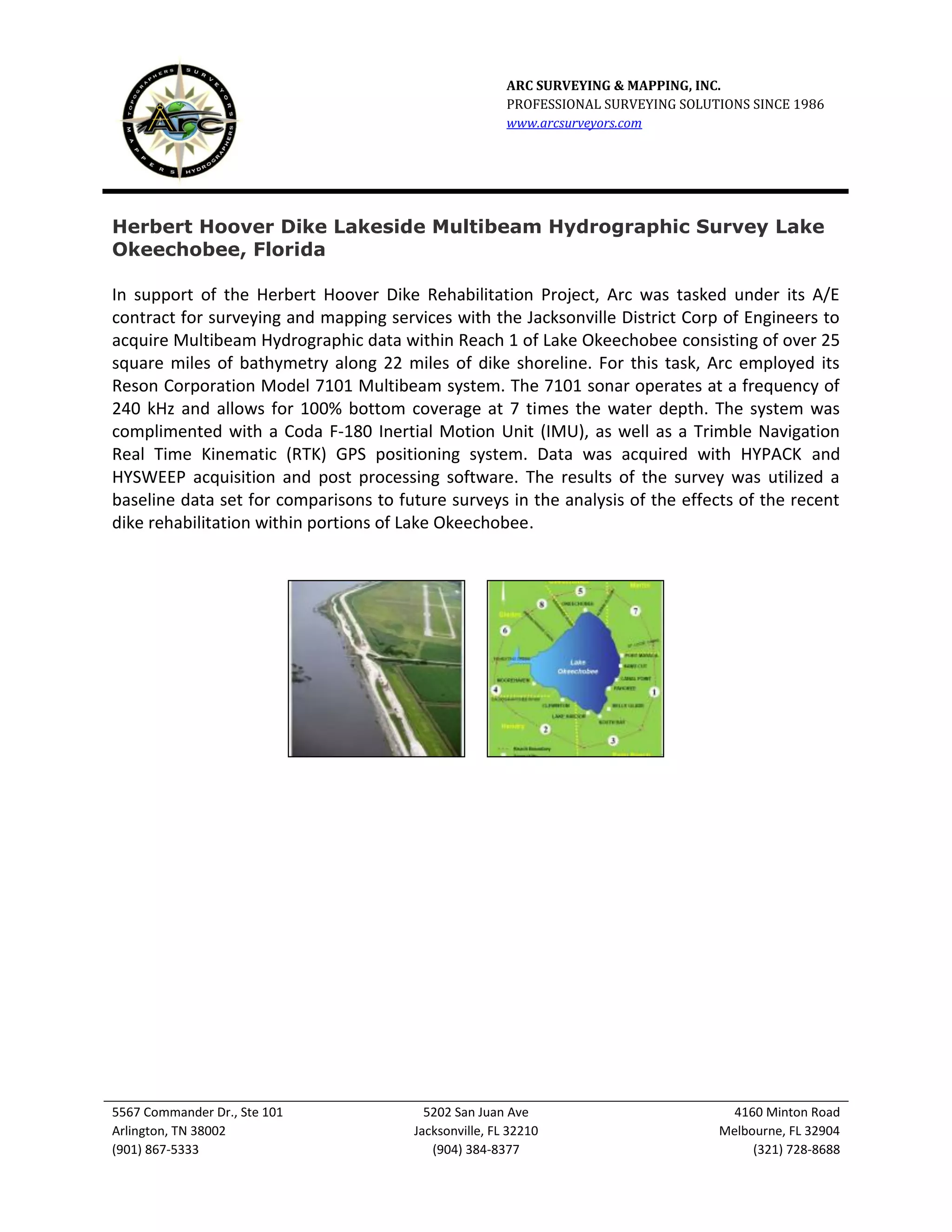 Arc Surveying & Mapping was tasked by the Jacksonville District Corp of Engineers to acquire multibeam hydrographic data of over 25 square miles of Lake Okeechobee along 22 miles of shoreline. Arc employed a Reson Corporation 7101 Multibeam sonar system, Coda F-180 IMU, and Trimble RTK GPS to map the lake bottom. The data was collected and processed using HYPACK and HYSWEEP software. The results provided a baseline data set to analyze changes from future surveys assessing the rehabilitation of the Herbert Hoover Dike within Lake Okeechobee.