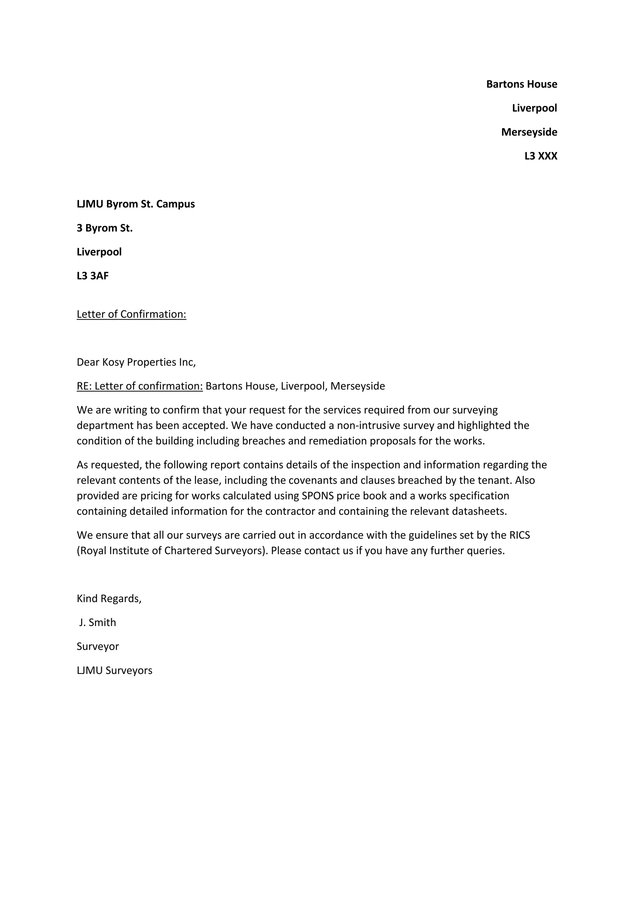 The document is a schedule of dilapidations for Bartons House in Liverpool prepared by LJMU Surveyors for Kosy Properties Inc. It identifies breaches of covenants in the lease for the property including reinstatement, decorating, and repairing obligations. 13 items are identified requiring remedy, such as removing partitions, installing emergency lighting, and repairing plaster. Costs are provided using rates from Spons price book. The schedule is to be read alongside the lease from 1991 between the landlord and tenant.