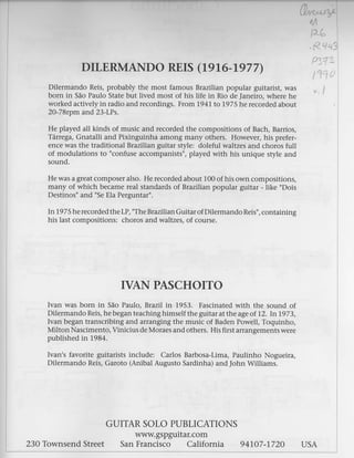 This document contains a transcription of guitar music by Brazilian guitarist Dilermando Reis. It includes 10 pieces of music: 8 waltzes and 2 choros. The transcriber, Ivan Paschoito, provides notes on the transcription process and criteria used. Biographies of Dilermando Reis and Ivan Paschoito are also included, which provide background information on the guitarist and transcriber.